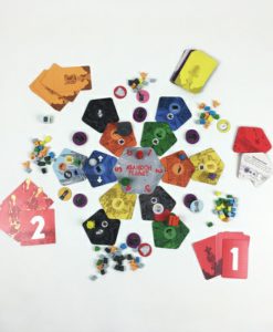 Every turn, each player secretly decides which direction to send their rocket. They reveal their choices simultaneously, then take turns collecting resources from the board, or stealing them from each other. This would all be safe and pleasant if it weren’t for the deadly meteor that will strike at the end of the round, drastically altering the map and damaging any rockets in its path. One player knows in advance where the meteor will hit, but depending on who they choose to share that information with well, friends tend to come and go during the meteor apocalypse.