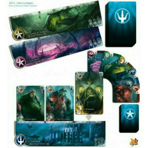 Abyss is a game of development, combination and collection in which players try to take control of strategic locations in an underwater city. To achieve this, players must develop on three levels: first by collecting allies, then using them to recruit Lords of the Abyss, who will then grant access to different parts of the city. Players acquire cards through a draft of sorts, and the Lords of the Abyss acquired on those cards grant special powers to the cardholder — but once you use the cards to acquire a location, that power is shut off, so players need to time their land grabs well in order to put themselves in the best position for when the game ends.