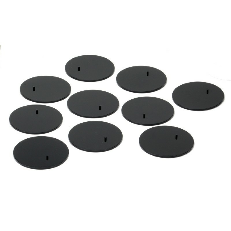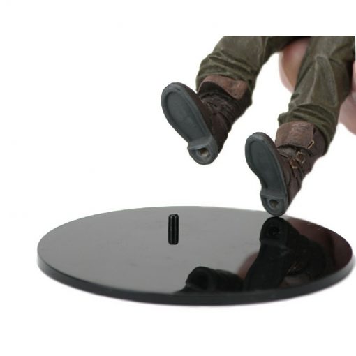 They measure 3.5? in diameter. The single peg can plug into a figureÂ’s right or left foot to help display or to achieve dramatic poses.