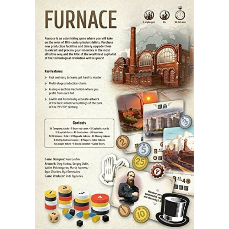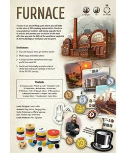 - Furnace is an engine-building Eurogame in which players take on the roles of 19th-century capitalists building their industrial corporations and aspiring to make as much money as they can by purchasing companies, extracting resources, and processing them in the best combinations possible