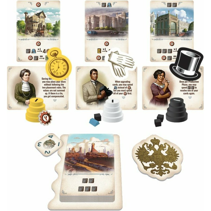 Furnace also includes capitalist cards that contain unique effects, and if you want, you can choose to deal one out to each player at the start of the game. For an additional challenge, you can require players to create a “production chain”, with each newly acquired company card being placed somewhere in that chain and locked in position for the remainder of the game.