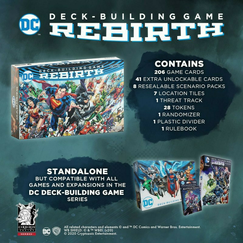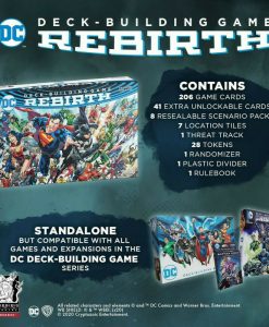 - A NEW EVOLUTION: Rebirth is a new evolution of the DC Deck-Building Game, breaking fresh ground by adding linked Campaign Scenarios, character progression, and movement between iconic locations from the DC Universe!
