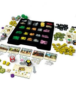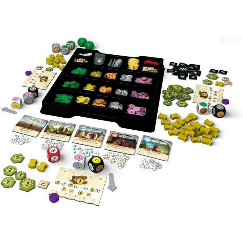 Each game is different as during setup, players draw five tiles (from a bag of 35) to determine which extra die faces will be available beyond the five standard lines of faces: lands (victory points), farming (grain), commerce (coins), Settlement (defense), and progress (upgrades). Each player begins with two identical dice and can gain more dice during play, in addition to upgrading their starting dice.