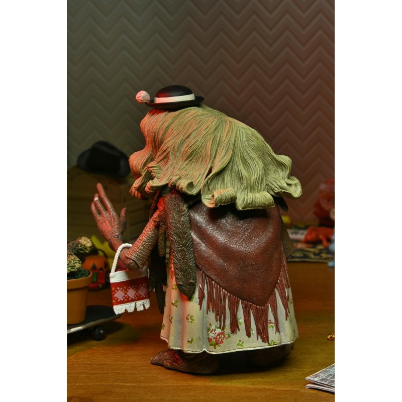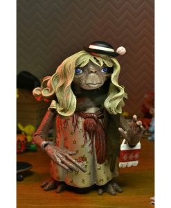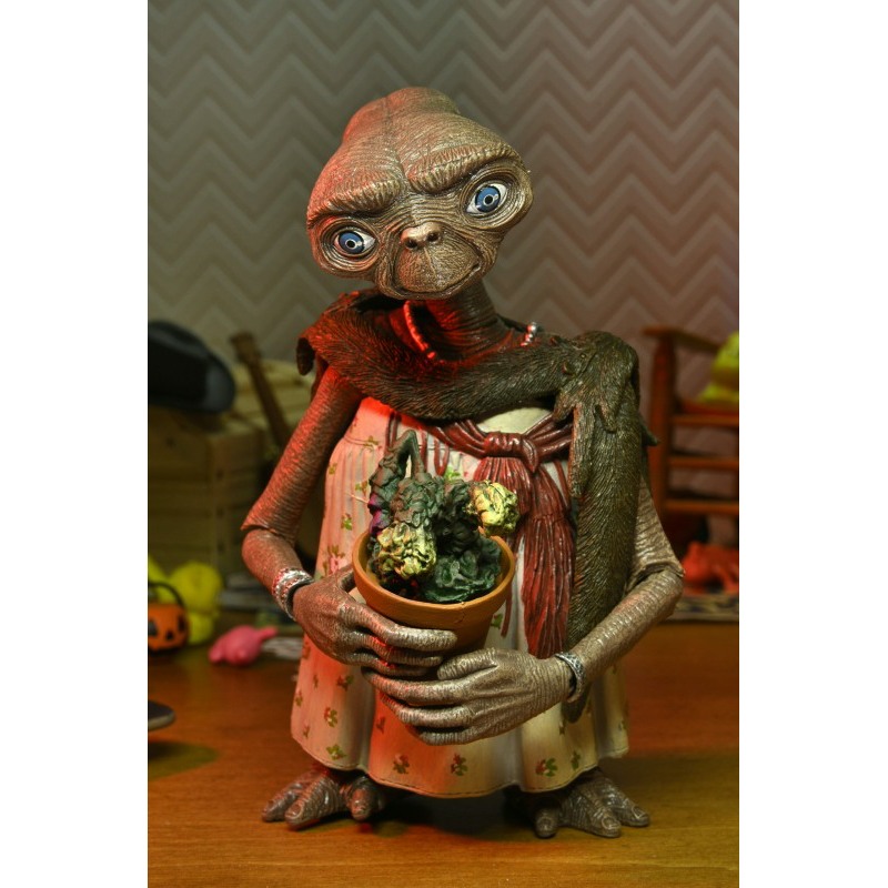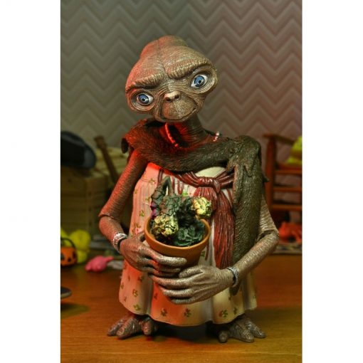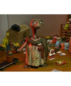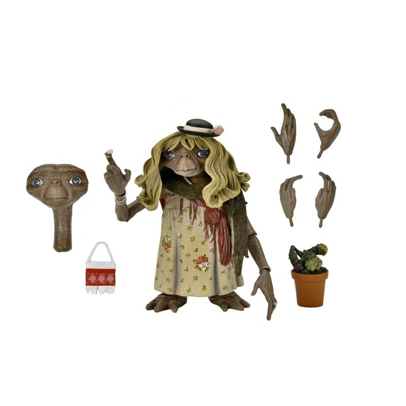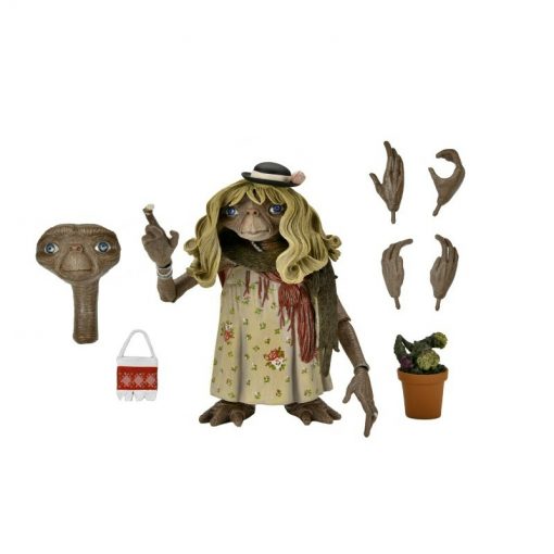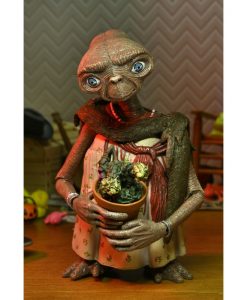 This Ultimate action figure celebrates the 40th anniversary of the beloved classic! Bring the magic and excitement of E.T. The Extra-Terrestrial into your world. As your friendship with E.T. grows, relive all of his earthly encounters or look to the stars and create your own unforgettable interactive adventures. Ultimate Dress-Up E.T. features incredible life-like detail and wears the dress from the playtime scene with Elliot’s little sister. E.T. stands in 7″ scale (meaning the figure is about 4.5″ tall) and is posable. Includes purse and potted plant, plus interchangeable heads (with and without wig), necks and hands. Comes in display-friendly 40th anniversary window box packaging with opening front flap.