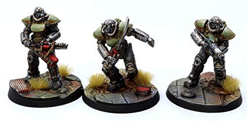 Modiphius Fallout Wasteland Warfare Unaligned T51 Power Armour Miniatures Set is one of the most iconic sets of personal-protective exo-suit plating in the wasteland. The armor platforms were so effective in close support and heavy weapon deployment that they are credited with turning the tide in Alaska for the American forces. This boxed set contains three 32mm scale multi-part high quality resin miniatures, each with unique scenic bases, to allow players to expand.