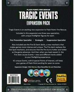 Tragic Events is an exciting new expansion to Flash Point: Fire Rescue. Included in this expansion are three new specialists, with unique figures for each: Fire Prevention Specialist, Strategist, and Supression Specialist. Also included are the Fire & Events decks, a new mechanic that makes games more intense and unique. The Fire deck replaces the Hot Spot mechanic, and ensures that the fire burns hotter and hotter as the game advances. And then when you least expect it, the Fire deck causes Events – new and different twists added to your firefighting experience. 42 unique Events, with 8 special Points of Interest, will keep your games of Flash Point exciting for years to come.
