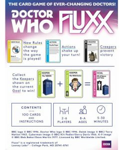 Doctor Who Fluxx takes the basic gameplay of Fluxx and merges it with multiple regenerations of the Doctor, various companions, Gallifreyan technology, K-9, Cybermen, Daleks, Weeping Angels, and the Master.