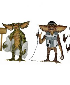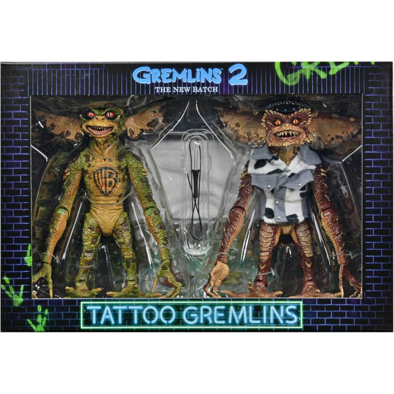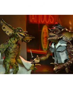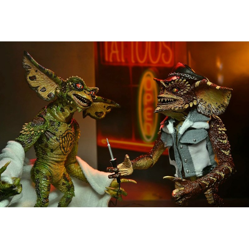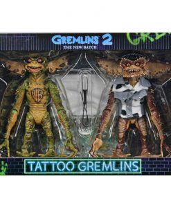 The Gremlins are back, and this time they’ve taken control of a high-tech skyscraper in New York City! From the sequel movie Gremlins 2: New Batch, these two 7″ scale, fully articulated Gremlins figures (approximately 6″ tall) have taken up residence in a tattoo parlor and are ready to show off their new ink. They come with interchangeable hands, tattoo instrument, mallet, sunglasses, riding crop, plus fabric towel and jean vest. Window box packaging.