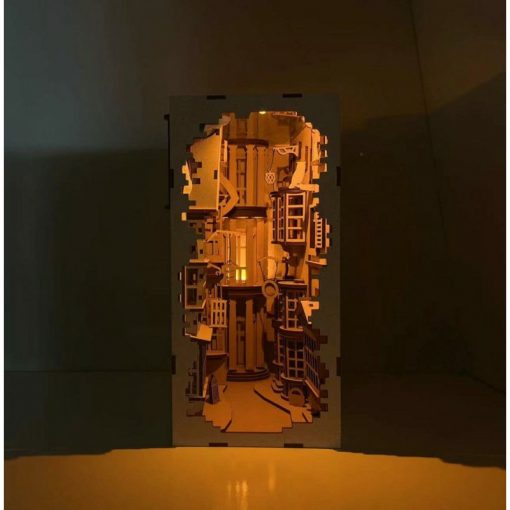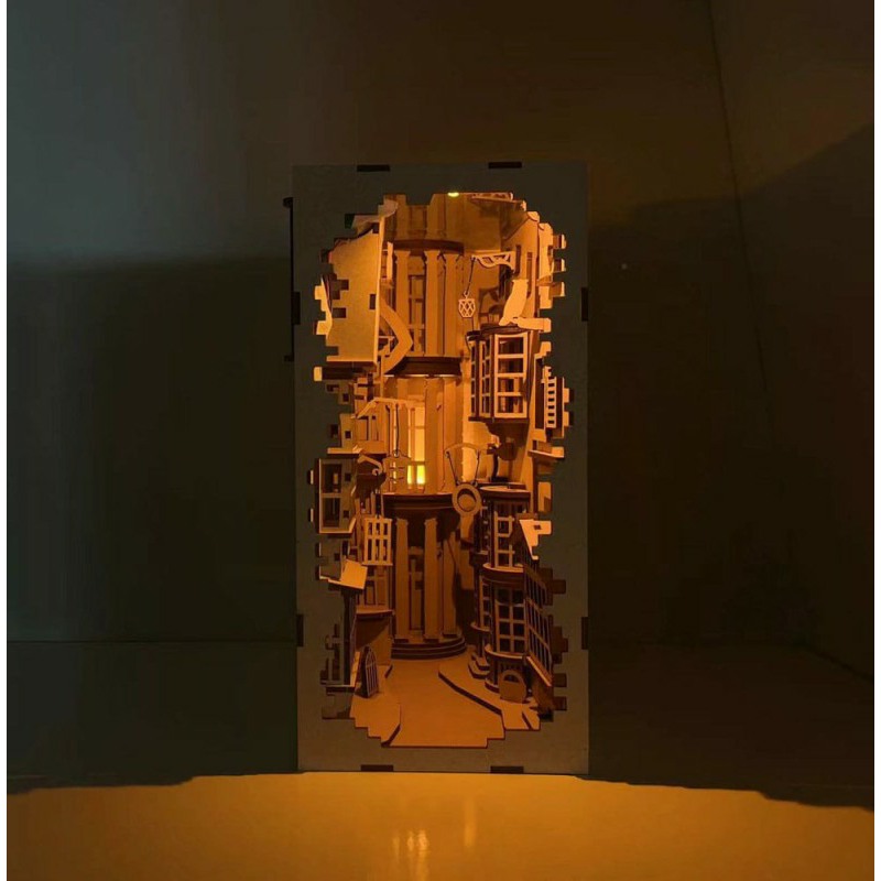- Model kit with 202 pieces – DIY bookend. The high-quality DIY kit contains 202 precisely manufactured parts for a unique bookend that shows buildings, signs and miniature characters of the famous wizard road