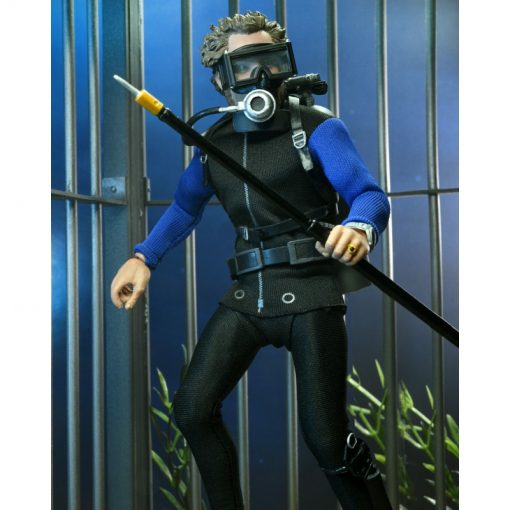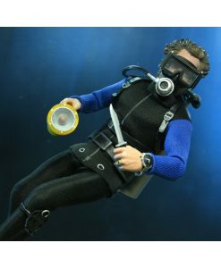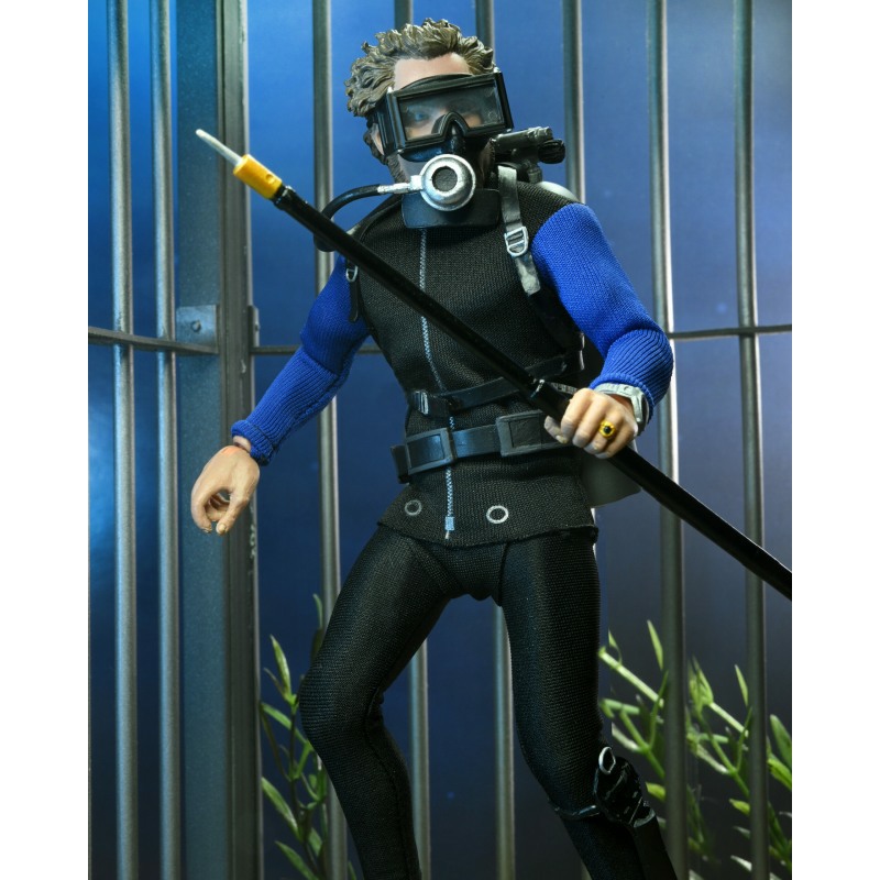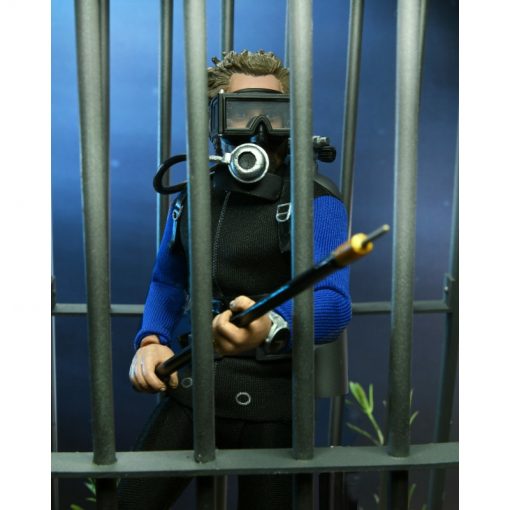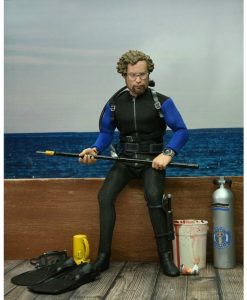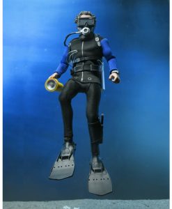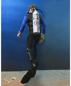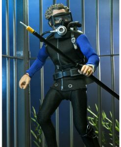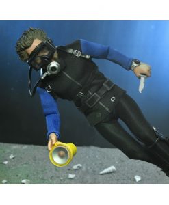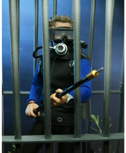 Based on the shark cage scenes, standing at 8″ tall, the young oceanographer is equipped with screen-accurate accessories (flippers, spear, underwater light, knife, and oxygen tank) as well as swappable heads. Window box packaging.