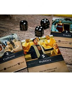 On your turn, you must take 2 of the following 7 Actions: Philosophy, Legislation, Culture, Trade, Military, Politics, or Development. Choose Actions that align with your strategy, but which also work with your dice roll.