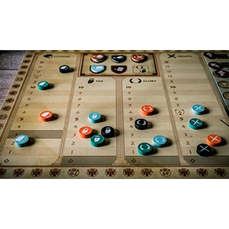 Move up on the Taxes Track to collect highly sought-after Drachmas, the Troop Track to Explore and gather Knowledge tokens, and the Glory Track to capitalize on your Knowledge.