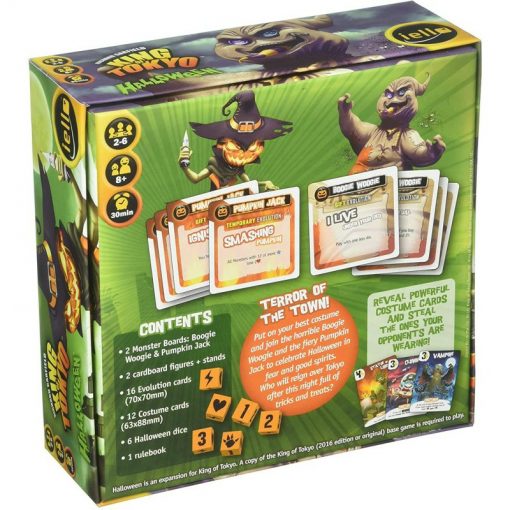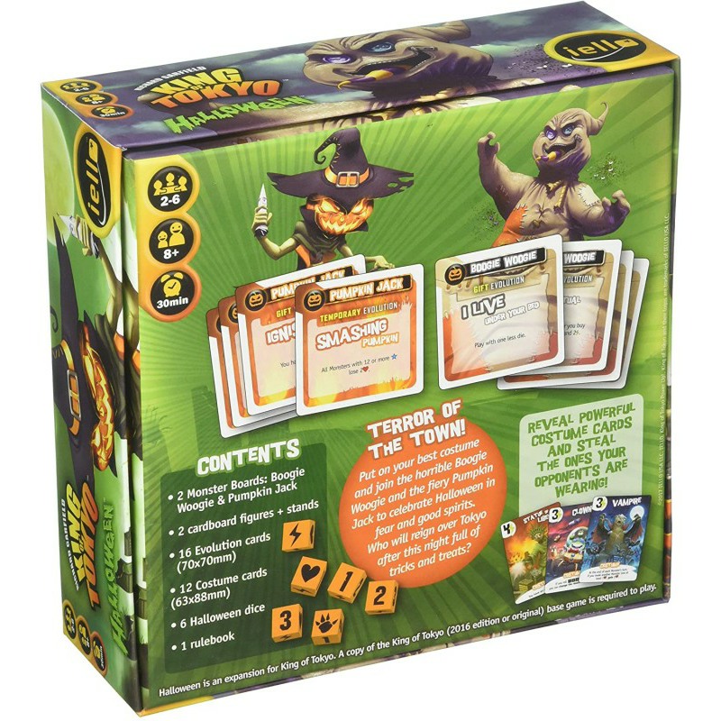 King of Tokyo: Halloween, which is subtitled “Collector Pack 1”, includes two new monsters for use with the King of Tokyo base game: Pumpkin Jack and Boogie Woogie. What’s more, each monster comes with its own set of eight Evolution cards – first introduced in King of Tokyo: Power Up! – so that each monster can mutate into an even more nightmarish version of itself!