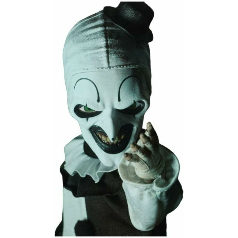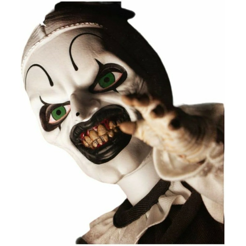 The demonic killer clown is all smiles, featuring an all-new head sculpt and sporting his signature black-and-white clown costume with pom-pom and ruffle detailing. Gripping a meat cleaver in his right hand, Art unleashes horror with his expressive mime-like manner and a desire for gruesome chaos.