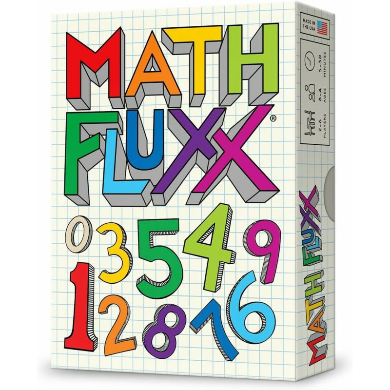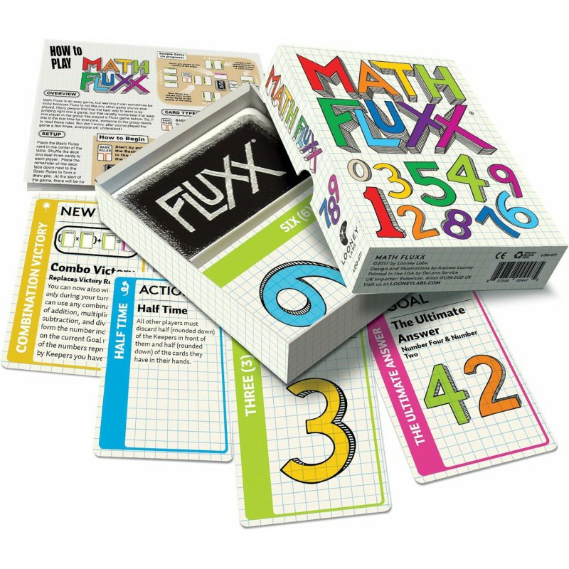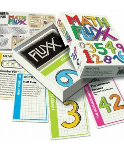 In this unique version of Fluxx, players collect single-digit numbers in order to form larger multi-digit numbers using mathematical operations. For example, if the Goal is 88 and you have Keepers for 1, 2, 4, and 5, you could play the New Rule called “Grafting” to combine your 4 and 5 into 45, then subtract the 1 to get 44 and multiply by 2 to get 88 and win the game! Because they need to be aware if a particular Goal will make your opponents win, students are doing constant mental math throughout the game, whether it’s their turn or not. For 2-6 players, ages 8 and up. Game Play It all begins with one basic rule: Draw one card, Play one card. You start with a hand of three cards.. add the card you drew to your hand, and then choose one card to play, following the directions written on your chosen card. As cards are drawn and played from the deck, the rules of the game change from how many cards are drawn, played or even how many cards you can hold at the end of your turn.