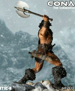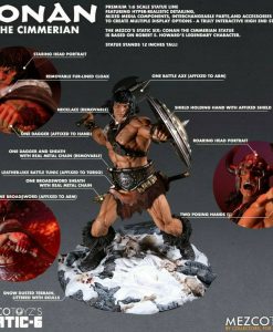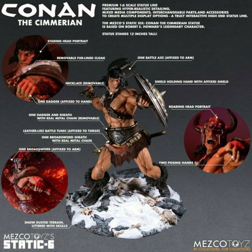 The Conan the Cimmerian Static Six 1:6 Scale Statue features: 2x head portraits (stare and roar) A broadsword (affixed to arm) and sheath with real-metal chain A battle axe (affixed to arm) A dagger (affixed to hand) A dagger and sheath with real-metal chain (removable) A shield (affixed to hand) 6x Interchangeable limbs Some other accessories are non-removable. Mezco’s Static Six is a premium 1:6 scale statue line featuring hyper-realistic detailing, mixed-media components, interchangeable parts, and accessories to create multiple display options. It’s a truly interactive high-end line of statues!