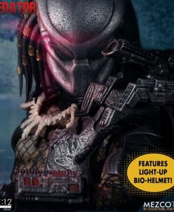 The One:12 Collective Predator is outfitted in battle armor with thermal netting and a fortified chest plate, allowing for greater mobility while hunting. The ruthless hunter comes with 2 removable bandoliers made from the bones of his prey and features a head portrait with an interchangeable mouthpiece and light-up bio-helmet – all attached via a magnet.