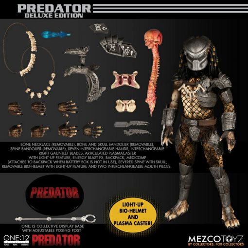 The One:12 Collective Predator is outfitted in battle armor with thermal netting and a fortified chest plate, allowing for greater mobility while hunting. The ruthless hunter comes with 2 removable bandoliers made from the bones of his prey and features a head portrait with an interchangeable mouthpiece and light-up bio-helmet – all attached via a magnet.