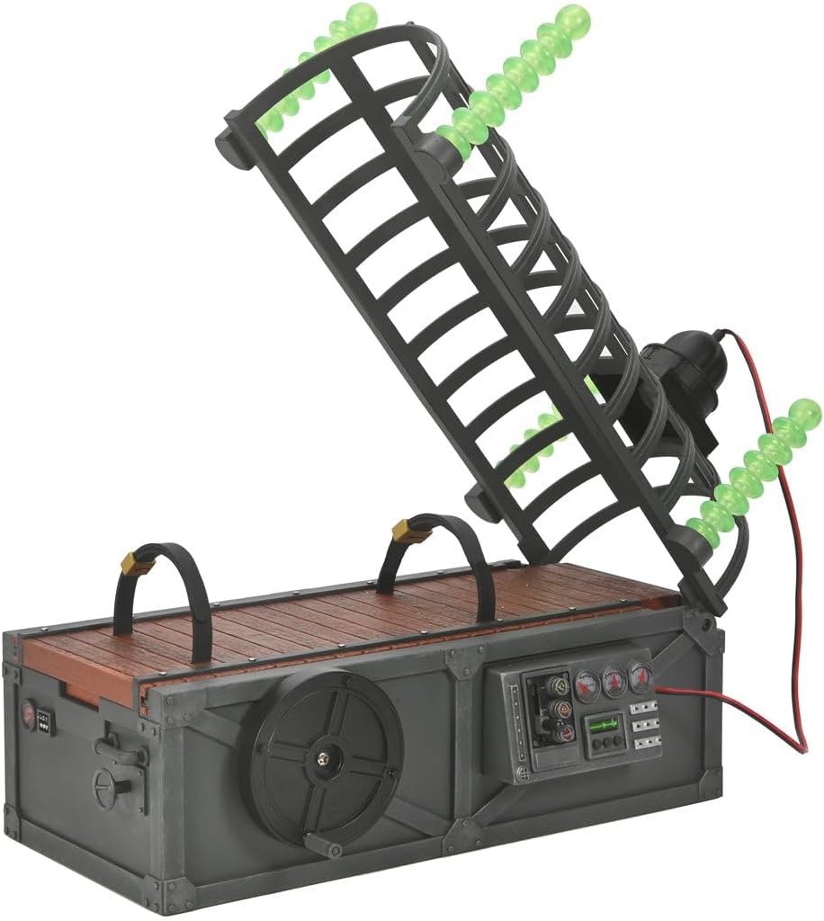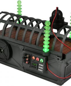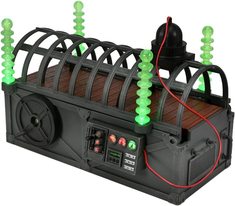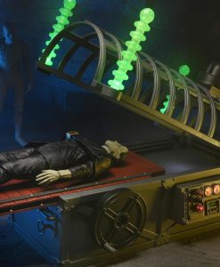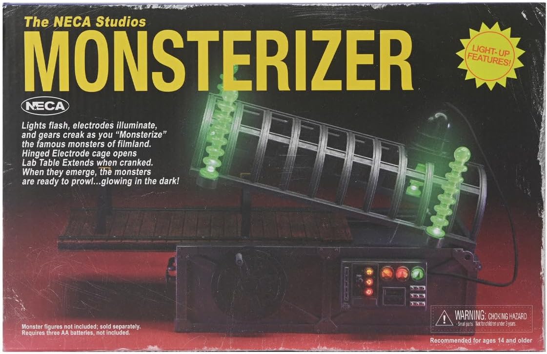 Lights flash, electrodes illuminate, and gears creak as you “Monsterize” the famous monsters of filmland with this tribute to the original Monsterizer from the ’80s! Designed to work with NECA’s line of retro glow-in-the-dark monster figures, this fantastic diorama piece will also work with other 7″ scale figures. The hinged electrode cage opens and the lab table extends when cranked. Strap your figure down with the easy fasten straps, lower the cage and flip the switch to activate the “Monsterizer” beam! When they emerge, the monsters are ready to prowl… This 10 inch monster-making machine features glow-in-the-dark electrode rods, illuminated dials, 4 different lever activated LED functions and a convenient storage drawer for your extra monster parts! Some assembly required. no tools needed. Uses 3x AA batteries, not included. Figures sold separately. This product is exclusive to the NECA Store in the US, and both The NECA store and retail for International customers.