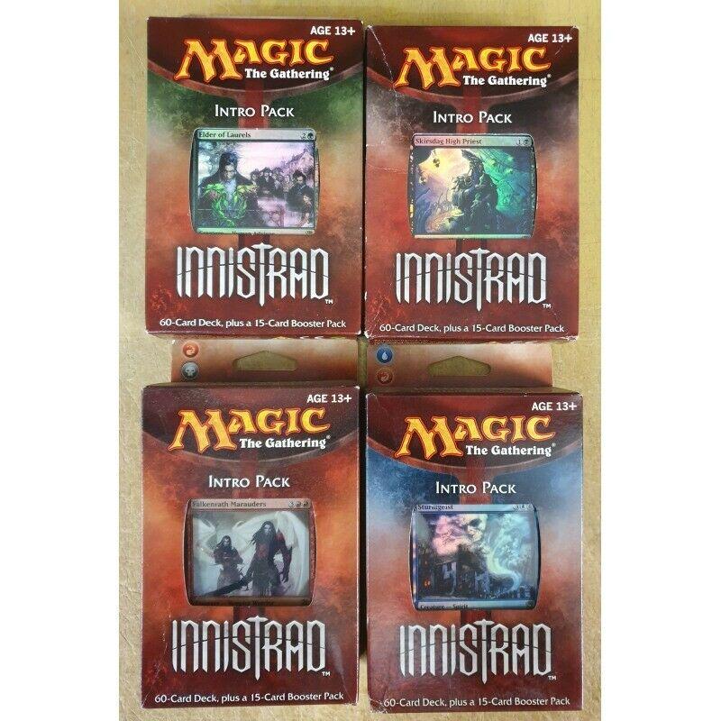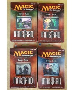 1 Each of the 4 different Intro Packs for Innistrad. Each pack contains a 60-card deck, 1 fixed foil rare, 1 random non-foil rare, 1 Innistrad booster pack, and a mechanics/rules insert. You will recieve all 4 of the following :- 1 x Carnival Of Blood 1 x Repel the Dark 1 x Deathly Dominion 1 x Eldritch Onslaught