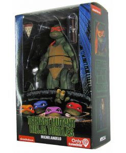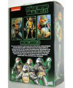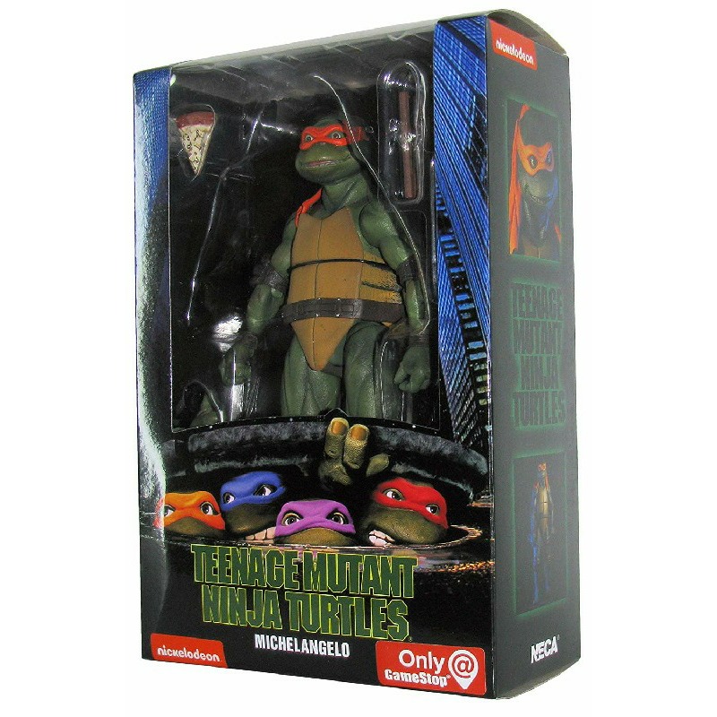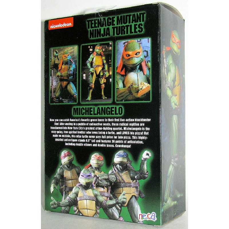 From the 1990 Teenage Mutant Ninja Turtles movie! After wading in a puddle of radioactive waste, four radical reptiles were transformed into New York Citys greatest crime-fighting quartet!These 7 scale figures are super articulated, highly detailed and entirely accurate to the movie. Each comes with signature weapon and other accessories, including (of course) a slice of pizza.