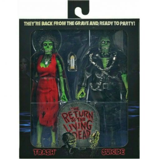 Neca presents, within the Clothed Action Figure collection, the pack of 2 figures composed by Trash & Suicide. They measure 20 cm and are based on the characters from the 1985 film “The Return of the Living Dead” in Spanish. They feature multiple points of articulation and include 1x spray paint and 1x tombstone with the movie logo. They are presented in a window box