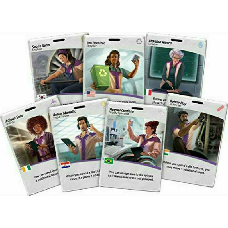 The nations of the world have pooled their resources and assembled a diverse crew. Each of the seven unique role cards features its own ability. The Analyst, Adjoua Soro, is able to re-roll the dice up to two additional times. The Engineer, Soojin Sohn, can change any die result with a plane to a different symbol. Take turns as quickly as possible, using your role’s unique ability and strategically allocating your dice to be as efficient as possible when creating supplies.
