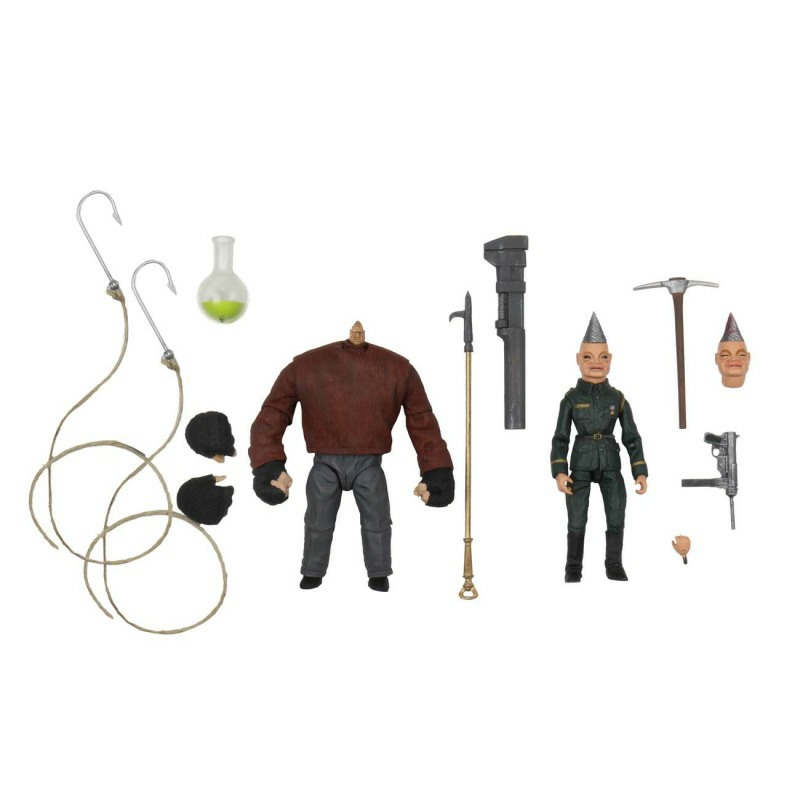 Pinhead includes two interchangeable hands, a fire poker, a vial of rejuvenation liquid, a wrench, and hooks. Tunneler is armed with a grease gun and pickaxe, along with interchangeable heads, hands, and an alternative bloody drill top.