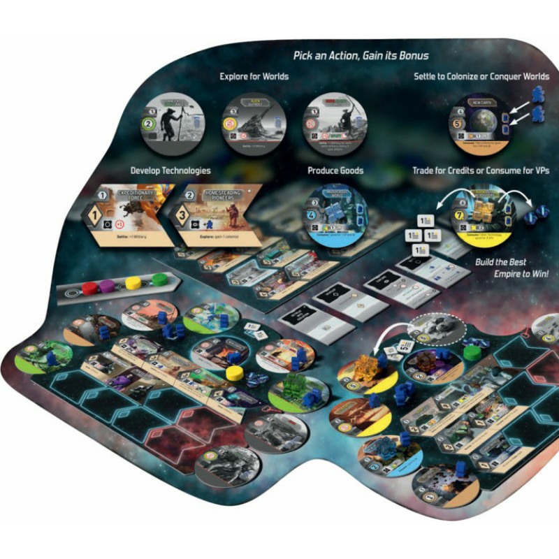 Play continues until one or more of four game ending conditions is reached. After all actions for that round have been done, the player with the most victory points from settled worlds, developments, 9-cost development bonuses, and VP chips earned from consuming goods wins.