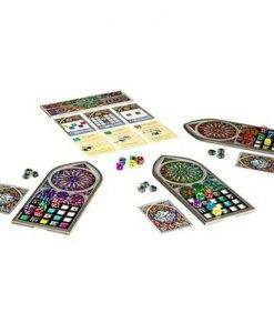 In more detail, each player builds a stained glass window by building up a grid of dice on their player board. Each board has some restrictions on which color or shade (value) of die can be placed there. Dice of the same shade or color may never be placed next to each other. Dice are drafted in player order, with the start player rotating each round, snaking back around after the last player drafts two dice. Scoring is variable per game based on achieving various patterns and varieties of placement…as well as bonus points for dark shades of a particular hidden goal color.