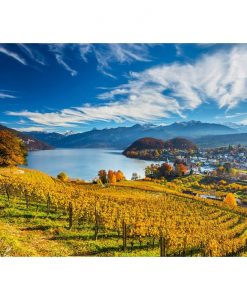 Stunning picturesque image of multiple vineyards overlooking a lake.