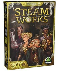 In the steampunk worker placement game Steam Works, you’ll put your mechanics to work collecting components and power sources, then you’ll literally build devices by assembling those sources and components. What’s more, those devices in turn become action spaces for other players to use!