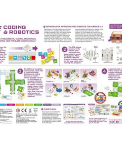 Meet Sammy. This cute little peanut butter and jelly sandwich is actually a robot that teaches coding principles and skills to children in grades K-2. You don’t need a tablet, smartphone, or computer to program this robot; programs are created by simply laying down a sequence of physical code cards. As the robot drives over the code cards, an OID optical scanner on the bottom of the robot reads the code cards one by one and loads the program. Next, place the robot on a grid made of map cards, and the robot runs the program. You can program the robot to move in different directions, activate its output gear, light up its LED, play sounds, and respond to different function cards. The integrated output gear makes it possible to build simple robotic creations with arms or other moving parts that respond according to the program’s instructions. This robot kit also teaches physical engineering and problem solving skills through a series of building and coding lessons. The 30 lessons are aligned with standards for computer science education developed by the Computer Science Teachers Association (CSTA) and the International Society for Technology (ISTE) Education, as well as courses from Code.org. The lessons progress in complexity through the illustrated manual, allowing the kit to be appropriate for a child as young as four years with help from an adult and as old as eight years. The lessons cover these six key areas in coding: sequencing, loops, events, conditionals, functions, and variables. In addition to Sammy, there are five other stories, each with a series of model-building and coding challenges and lessons related to it: a mouse moves through a maze to find cheese; a penguin wanders around a zoo; a soccer player moves a ball into the goal; a fire truck puts out a fire; and a factory robot performs tasks in a factory scene. A full-color illustrated manual guides users through the coding lessons and the assembly of the different models.