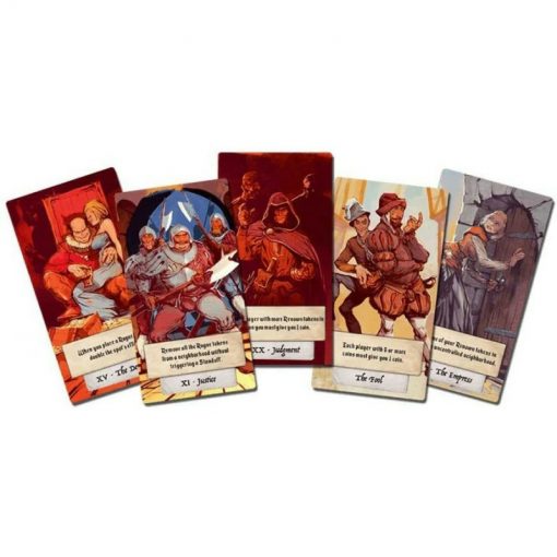 When a neighborhood is fully occupied, settle a standoff revealing each player’s Rogue(s) token to know which player takes control of the neighborhood.