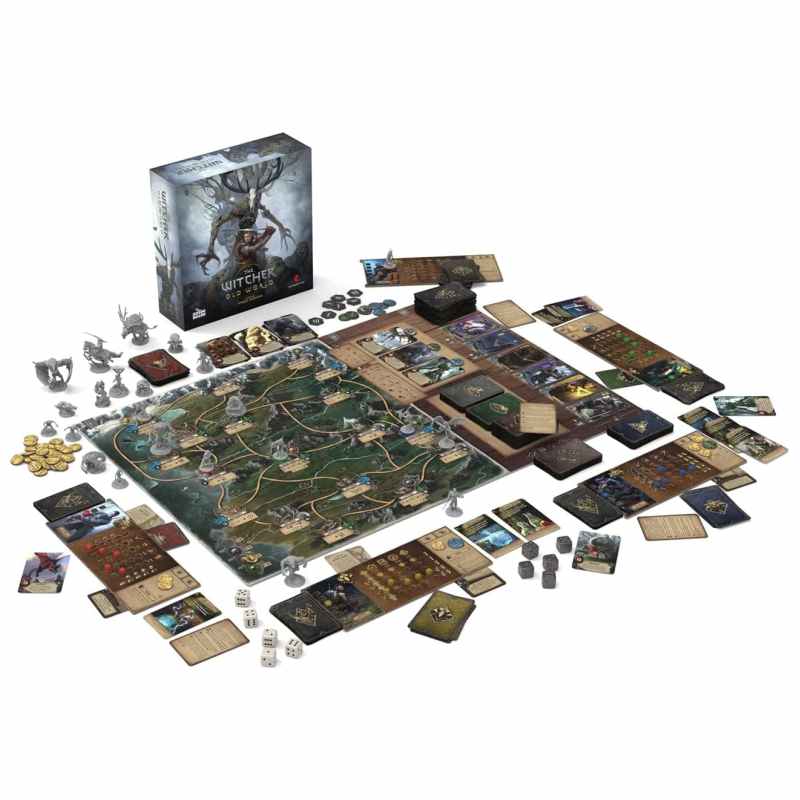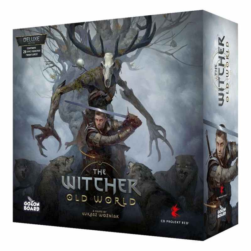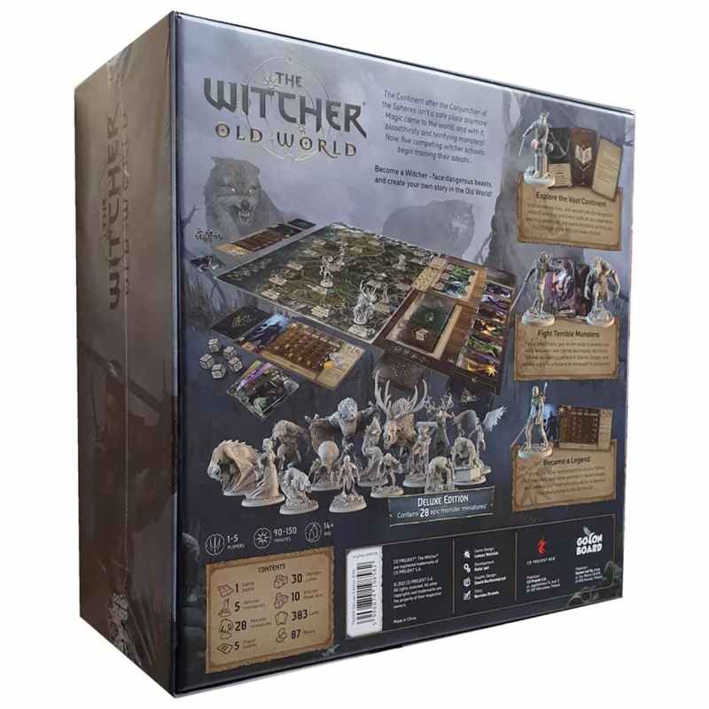 The Witcher: Old World sees 1 to 5 players travelling across a vast map embarking on masterfully penned quests encountering and making ambiguous moral choices fighting monsters — and sometimes even brawling with other witchers to defend their school s honor! The game lets players construct their own unique decks of cards by choosing from a wide range of abilities: attacks dodges and witcher combat magic — known as Signs. Through card synergy players aim to achieve powerful combos as they utilize their witcher school s hallmark abilities to their full potential. Quests battles and even dice poker will allow each player to earn money obtain new items and train their skills. Become the mightiest witcher on the Continent. A great adventure awaits! The deluxe edition includes 28 monster miniatures 1 closed tavern miniature and 5 plastic scoring tokens not found in the standard version.