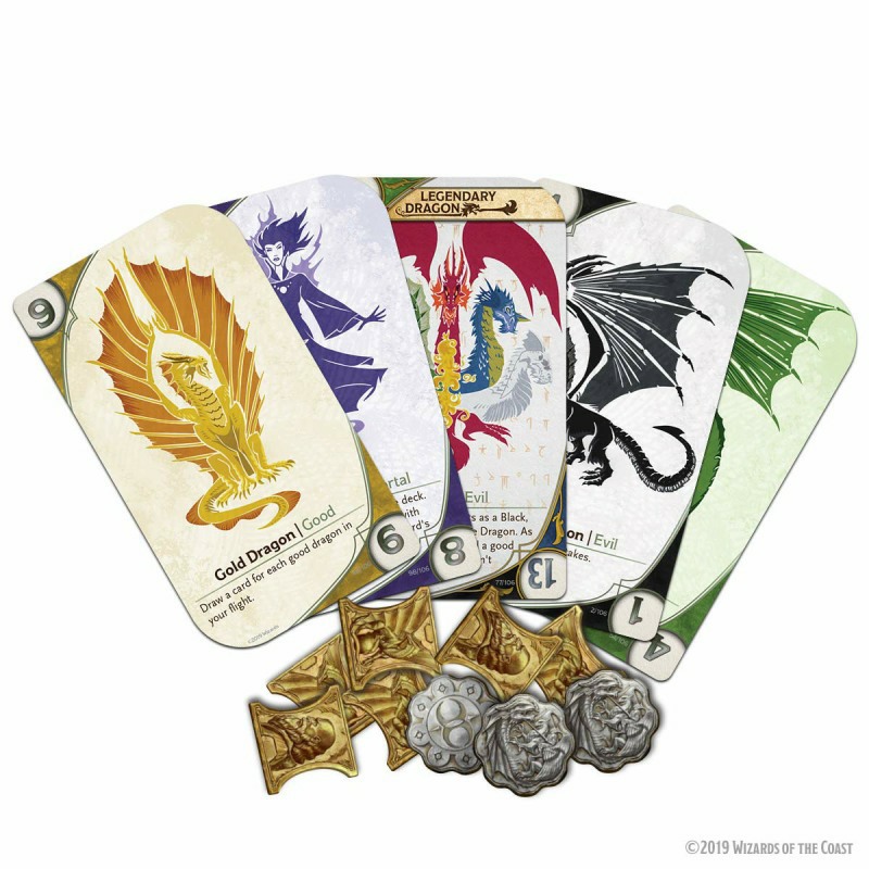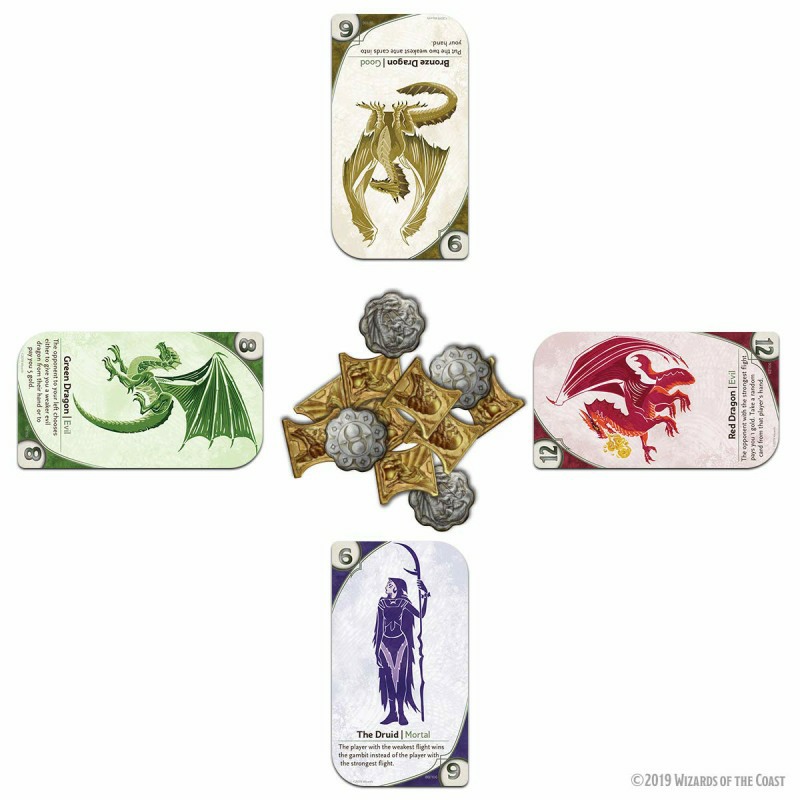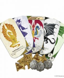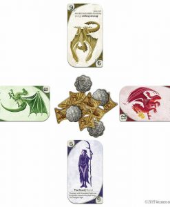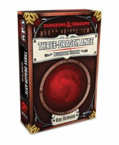 Three-Dragon Ante: Legendary Edition is a card game of wagers and strategy that’s fast paced with beautiful dragon-themed card art. Fun to play on its own or add it to your Dungeons & Dragons campaign as an immersive, in-character tavern game. Each game is played with 80 cards – 70 Standard Dragon cards and 10 chosen from the 30 Mortal and Legendary Dragon cards. Use one of the suggested theme decks, or choose the 10 cards randomly to add endless replayability. Players start with gold in their hoard, choose one card to play from their hand, then ante the amount of gold equal to the highest strength. Each player then plays a card from their hand in front of them, in turn order. Play continues for 3 rounds, then the player with the highest strength flight wins the gambit and all coins in the middle.