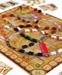 Players take turns until someone has no more than two carts in their supply, then each player takes one final turn, including the player who triggered the end of the game. Players then sum their points, scoring points for the routes that they’ve claimed during the game, the trade contract tickets that they’ve completed (by connecting the two locations on a ticket by a continuous line of their carts), and their standing among those who hold merchandise bonus cards. Whoever holds the most cards collects 8 points, with other players collecting fewer points. You lose points for any uncompleted contract tickets, then whoever has the high score wins!