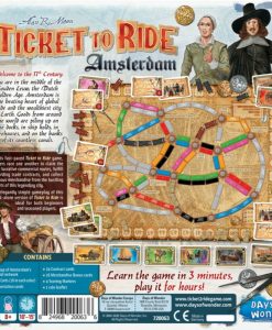 Ticket to Ride: Amsterdam features the familiar gameplay from the Ticket to Ride game series — collect cards, claim routes, draw tickets — but on a map of 17th century Amsterdam that allows you to complete a game in no more than 15 minutes.