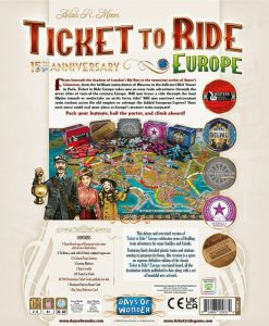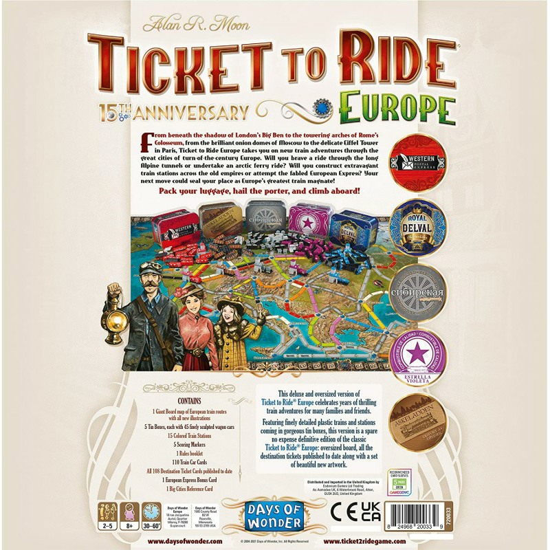 This deluxe and oversized version of Ticket to Ride Europe celebrates years of thrilling train adventures for many families and friends. Featuring finely detailed plastic trains and stations coming in gorgeous tin boxes, this version is a spare no expense definitive edition of the classic Ticket to Ride® Europe: oversized board, all the destination tickets published to date along with a set of beautiful new artwork. In Ticket to Ride: Europe, you collect cards of various types of train cars that you then use to claim railway routes in Europe. The longer the routes, the more points you earn! If you fulfil destination tickets — goal cards that connect distant cities — then you receive bonus points at the end of the game; fail to connect the cities on your tickets with rail routes, and you lose those points instead. Ticket to Ride: Europe – 15th Anniversary contains material from the Ticket to Ride: Europe base game and the Europa 1912 expansion for a total of 108 destination ticket cards. 2-5 Players, 30-60 min play time, age 8+