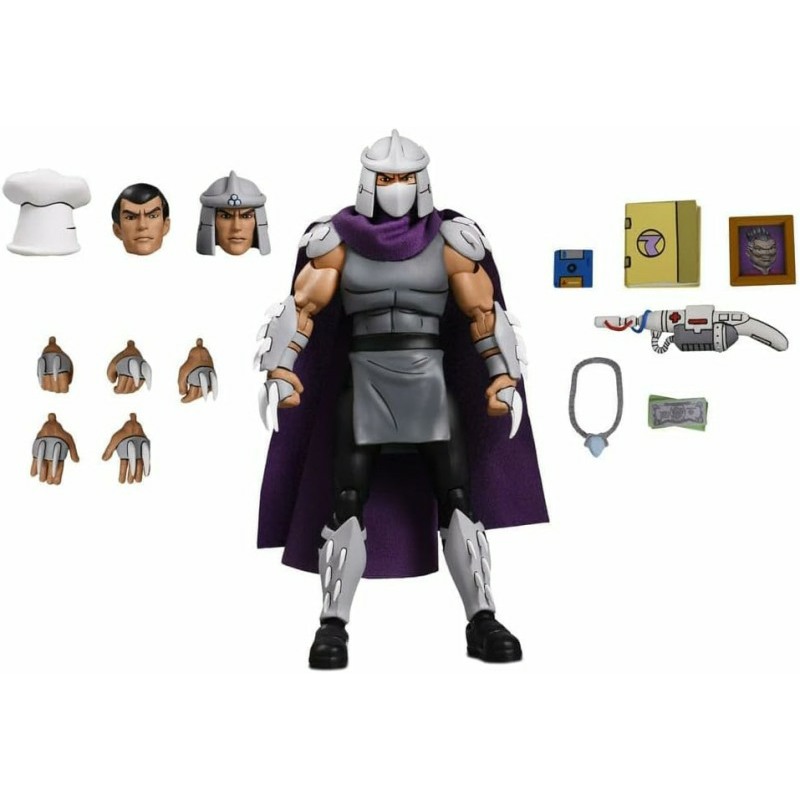 Neca Features the classic colors of Ultimate Shredder, based on the 1980s television series Teenage Mutant Ninja Turtles. This figure stands 18cm and includes 2x interchangeable heads, 4x extra hands, 1x floppy disk, 1x weapon, 1x necklace, 1x pack of banknotes, 1x photo frame and episode-inspired accessories. Comes in a window box with hinged front lid.