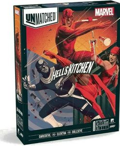 Unmatched: Hell’s Kitchen features three characters from the Marvel comics universe: Daredevil, Elektra, and Bullseye.